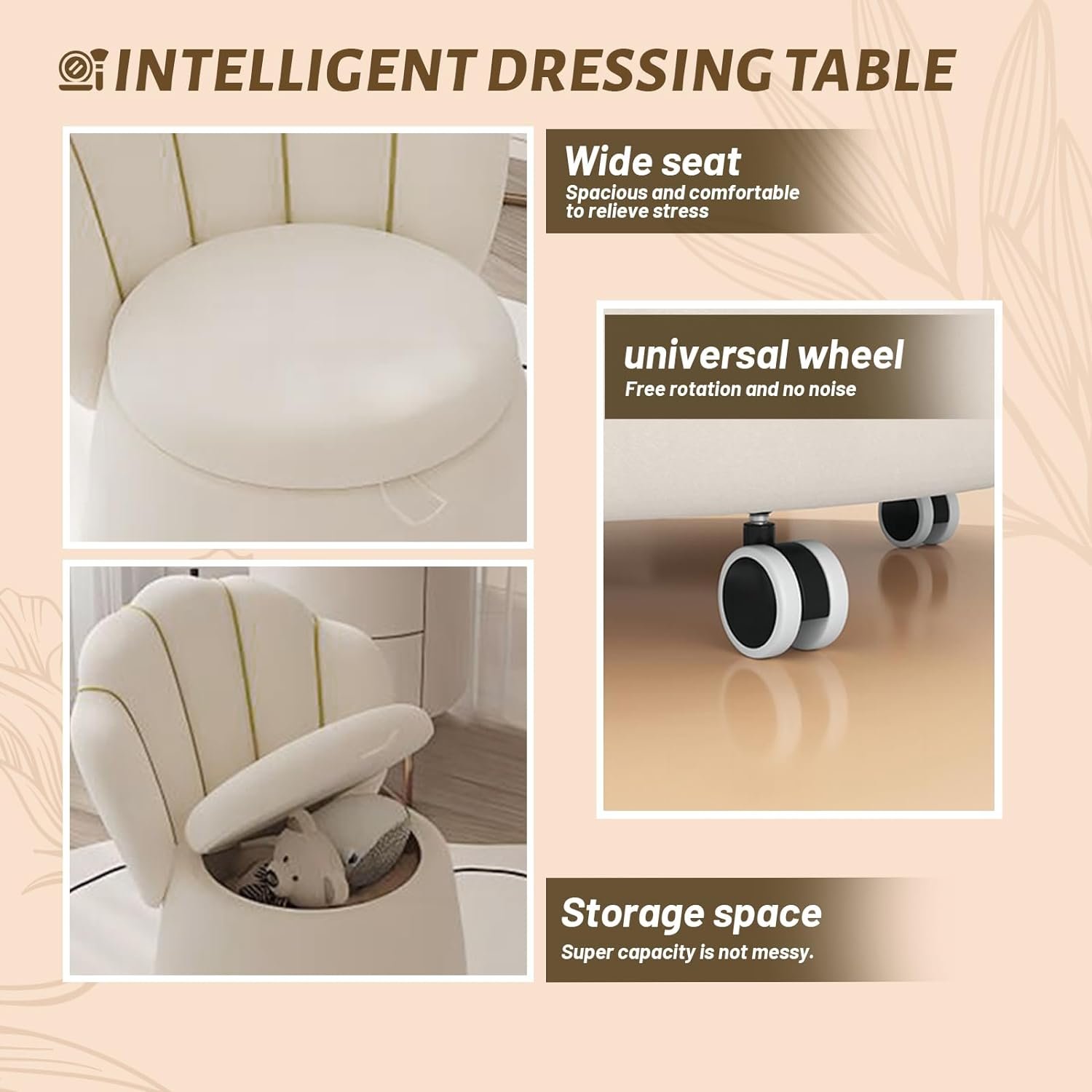كنت أبحث عن كرسي لا يشغل مساحة كبيرة، وهذا الكرسي يناسبني تمامًا. عجلاته ناعمة، ومساحة التخزين واسعة بشكل مدهش.