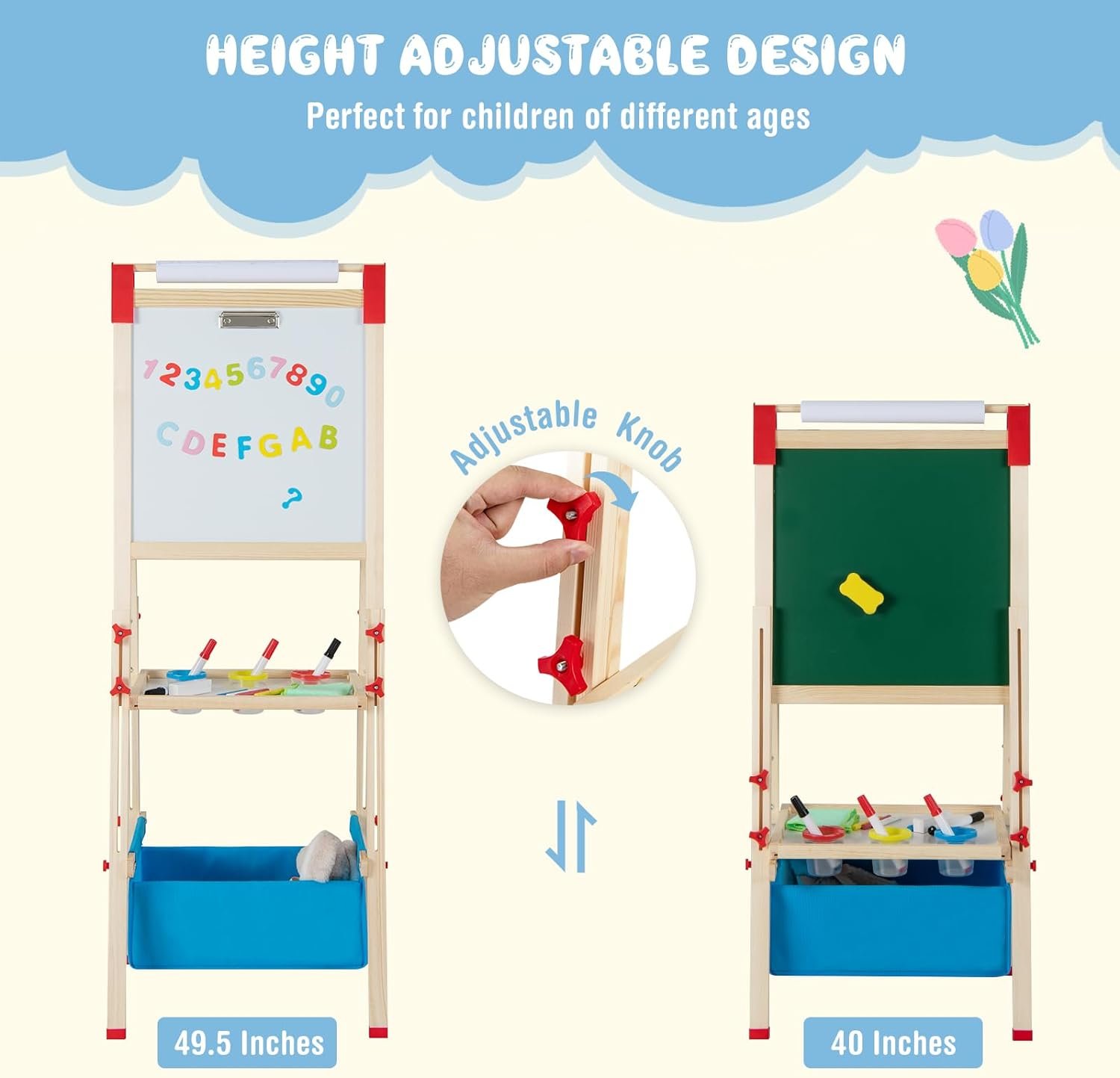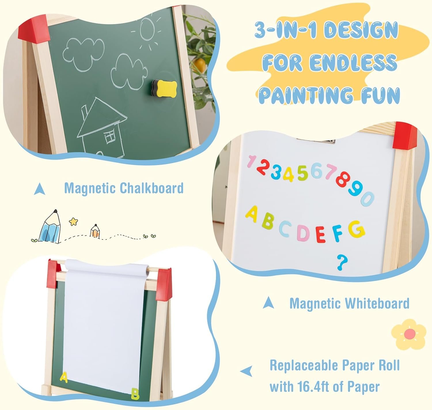 Our interactive easel is specially designed to foster artistic development and creativity in children. Featuring adjustable height settings, it accommodates kids of different ages and heights, ensuring comfortable engagement in various artistic activities. The toddler easel boasts a magnetic chalkboard and a whiteboard, offering children multiple options for expressing their creativity. Plus, ample storage space keeps art supplies neatly organized, while the solid wood frame ensures sturdiness and durability. 🌟