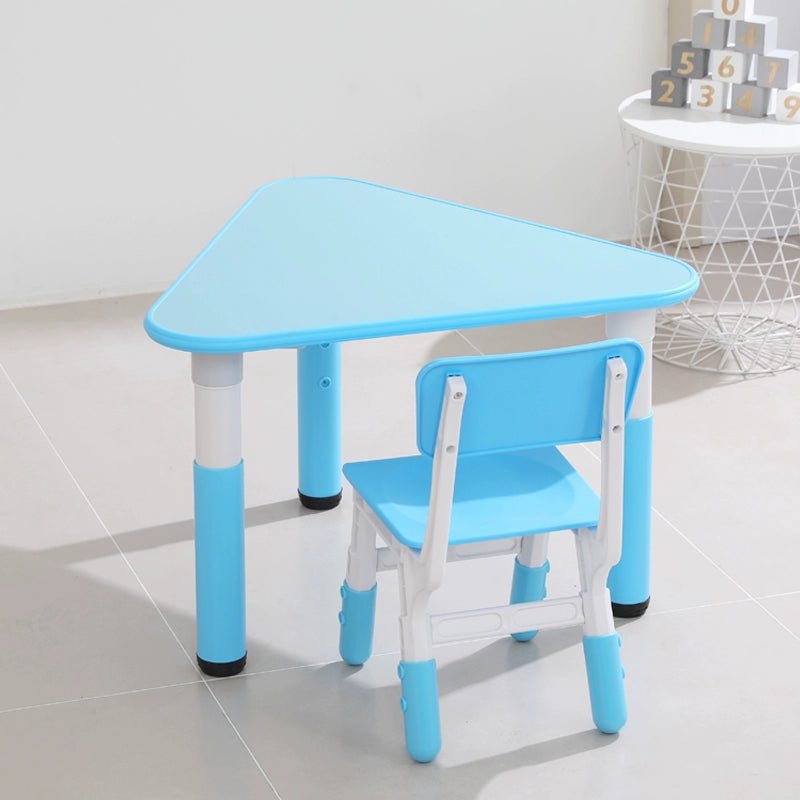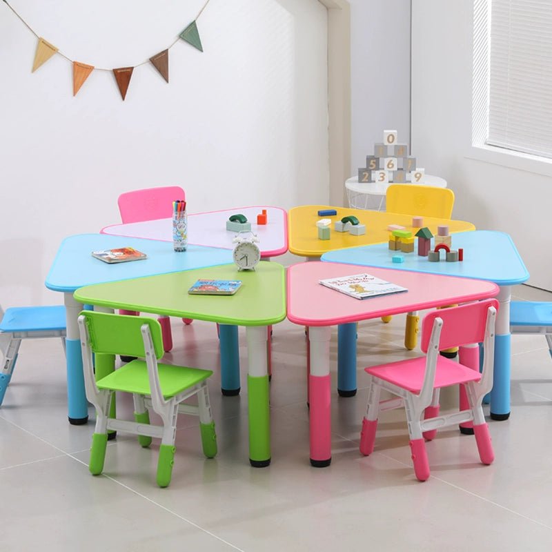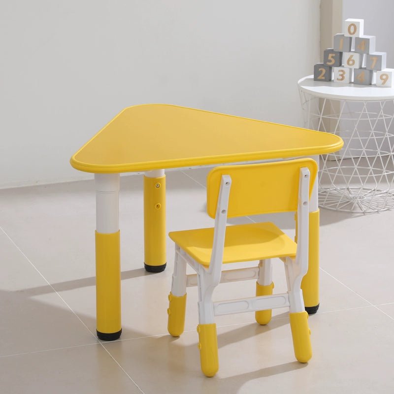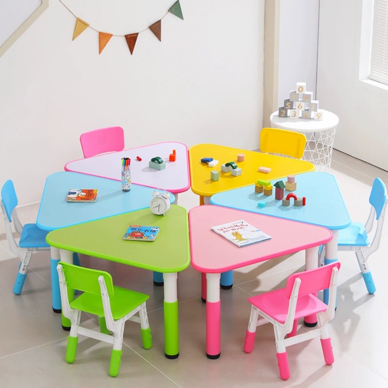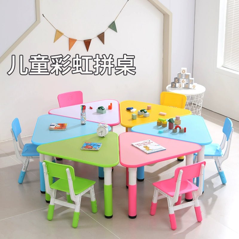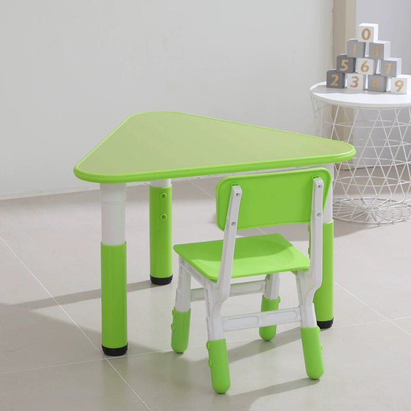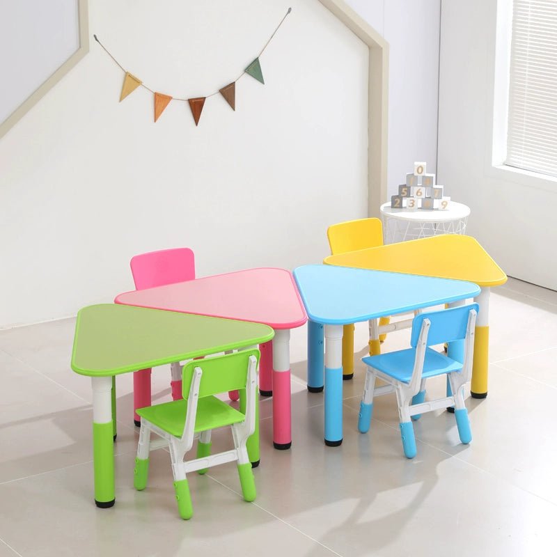• sort by color:Triangular table full set of 6 pieces including chairs Triangular table full set of 6 pieces excluding chairs Pink single table Sky blue single table Yellow single table Green single table Pink one table and 1 chair Yellow one table and 1 chair Light blue one table and 1 chair Green one table and 1 chair Single chair (color message)