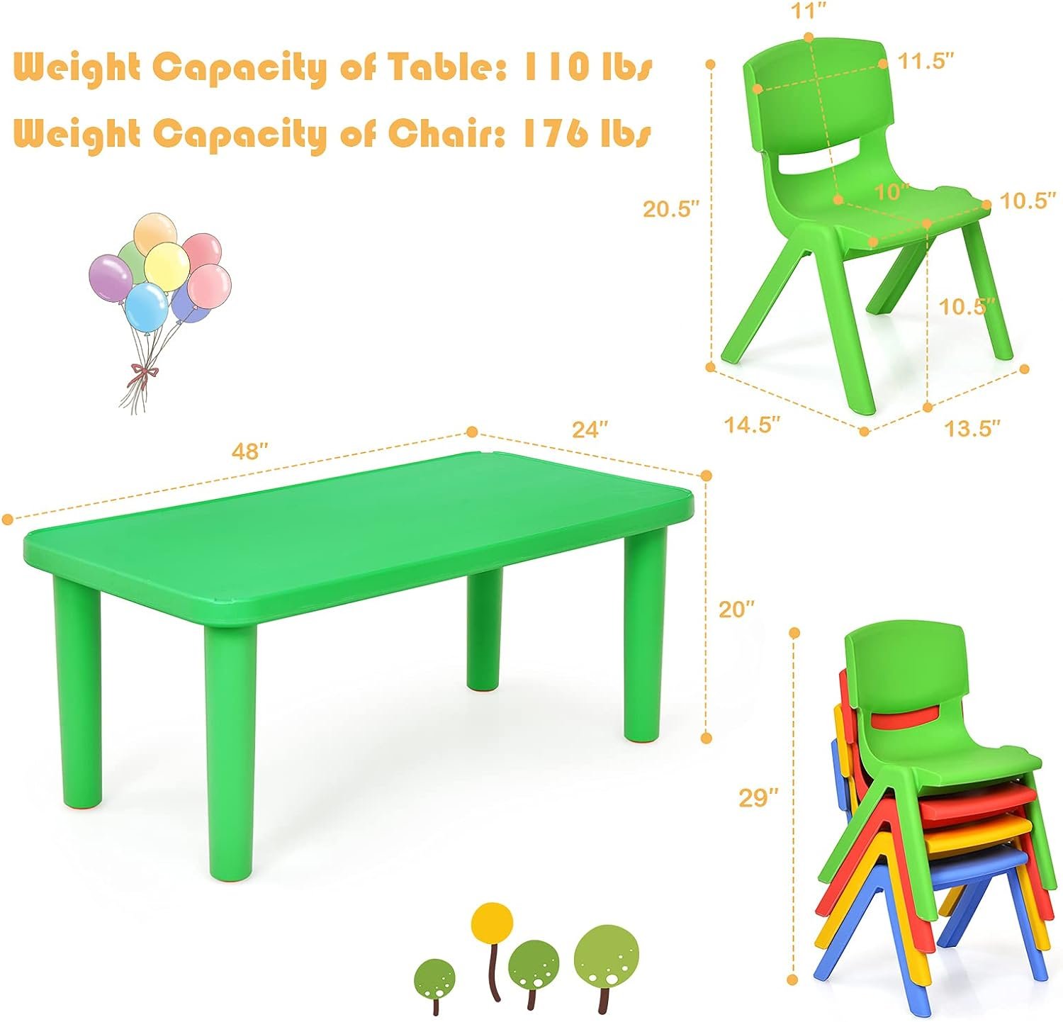 🚀 Compact Design & Easy to Carry: Designed with modern small-sized families in mind, our stackable chairs offer a compact storage solution. Lightweight and easy to maneuver, kids can effortlessly move the table and chairs independently, fostering their sense of autonomy.