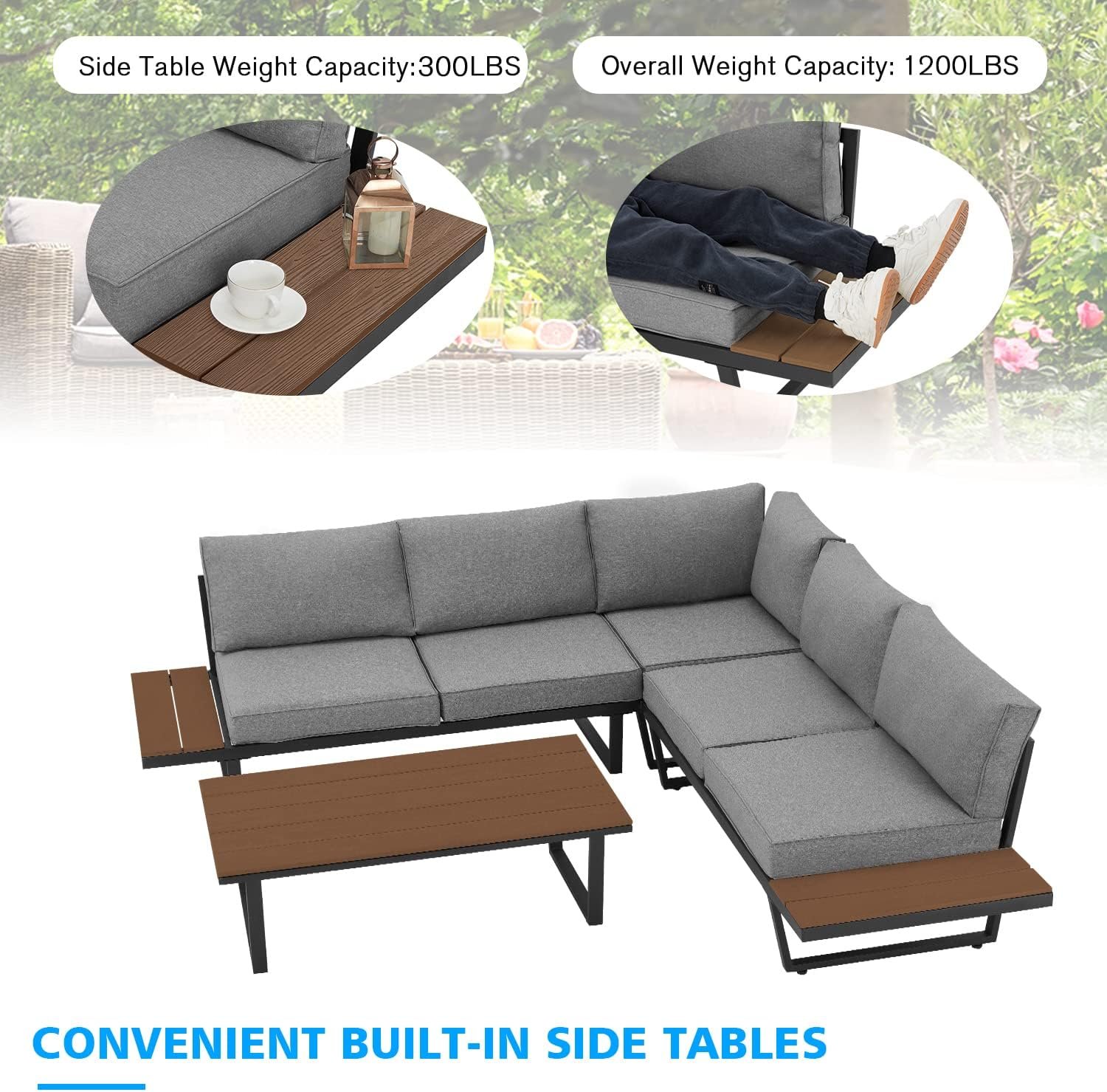 🌟 Versatile Design: With a weight capacity of 1200lbs overall, including 100lbs for the coffee table and 300lbs for the built-in side table, this sofa set offers both strength and style. The package includes 1 corner single sofa, 1 coffee table, 2 loveseats, 5 seat cushions, 6 back cushions, and a manual for easy assembly.