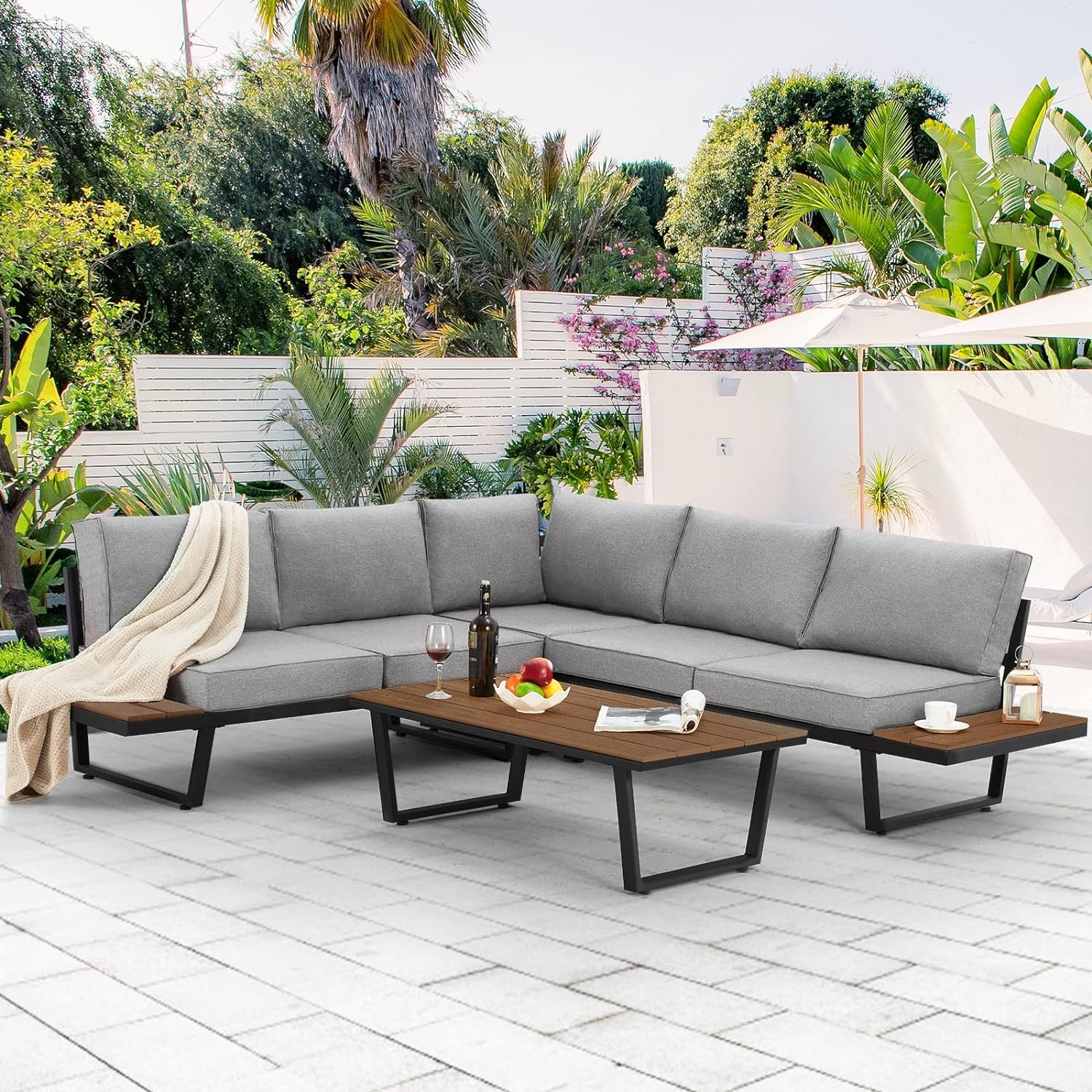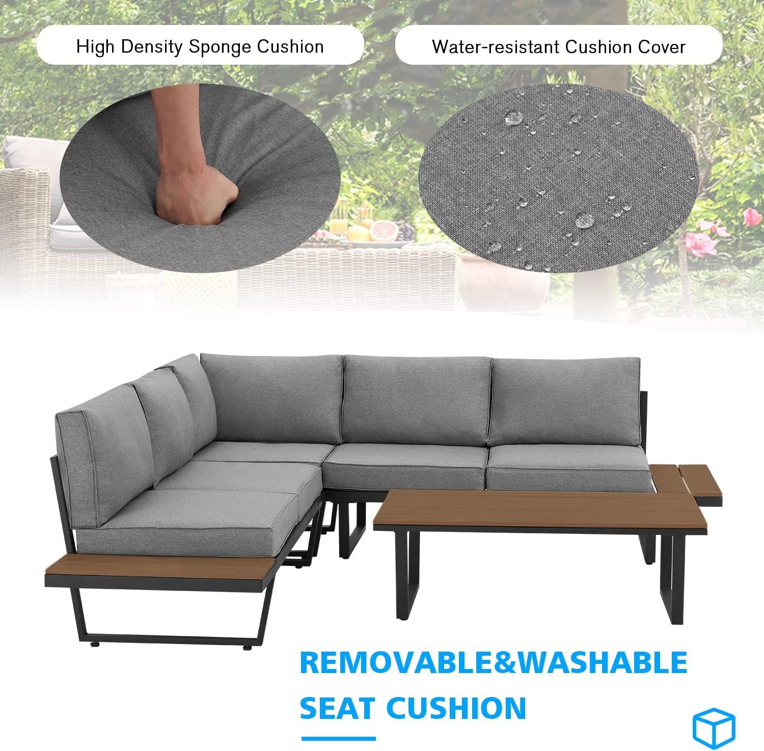 🏡 Understated Elegance: Elevate your indoor and outdoor spaces with this contemporary patio sofa set, exuding understated elegance. Whether it’s your living room, hotel lobby, patio, or garden, this L-shaped metal sofa set adds a touch of beauty to your life.