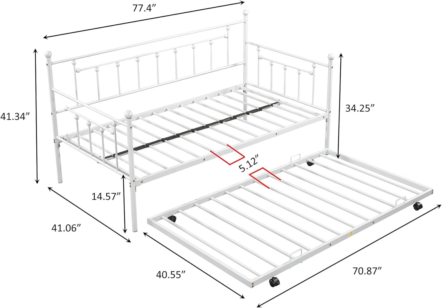 💪 Heavy Duty Construction: Crafted with strong and sturdy metal, this bed frame ensures durability and stability. Supports up to 400lbs for both daybed and trundle. Overall dimensions: 77.4″L x 41.06″W x 41.34″H. Trundle Bed Dimensions: 70.87″L x 40.55″W.