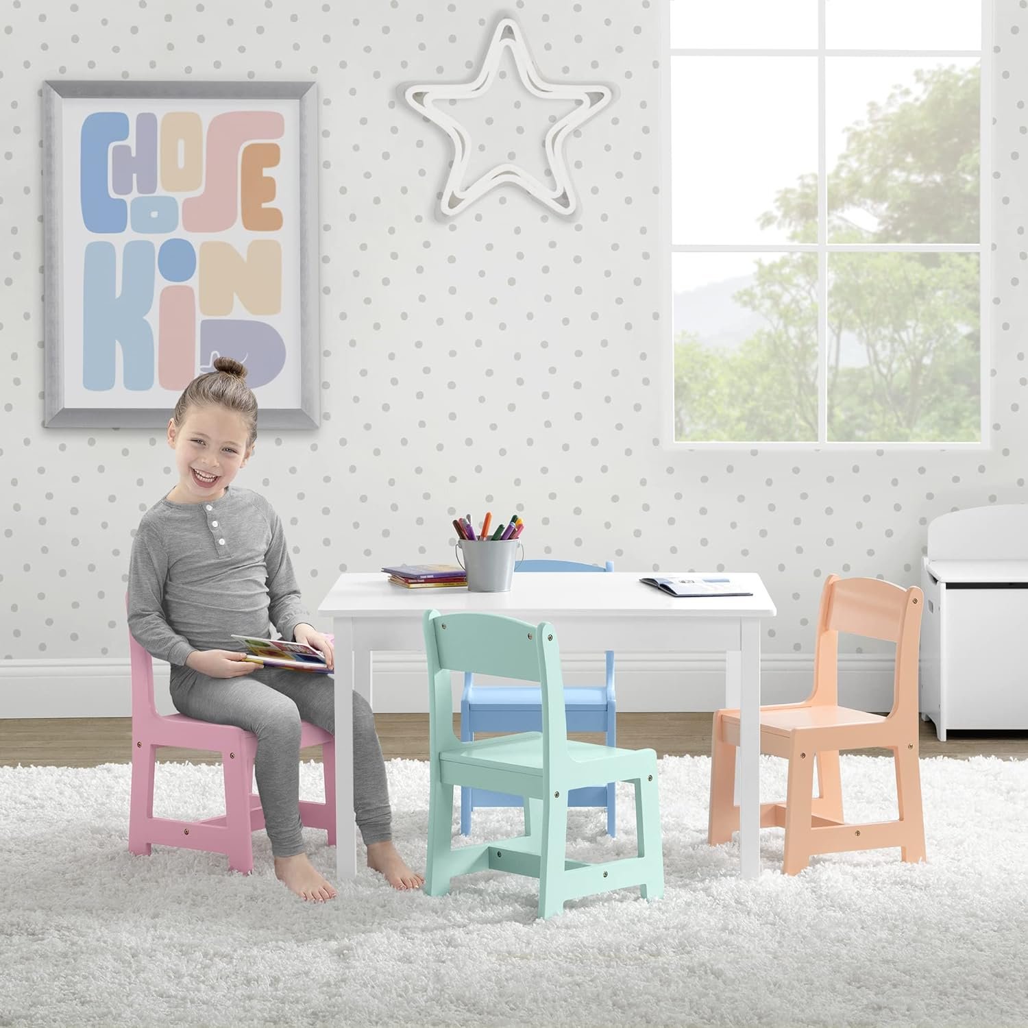• 1 table and 4 chairs, all at a kid-friendly height