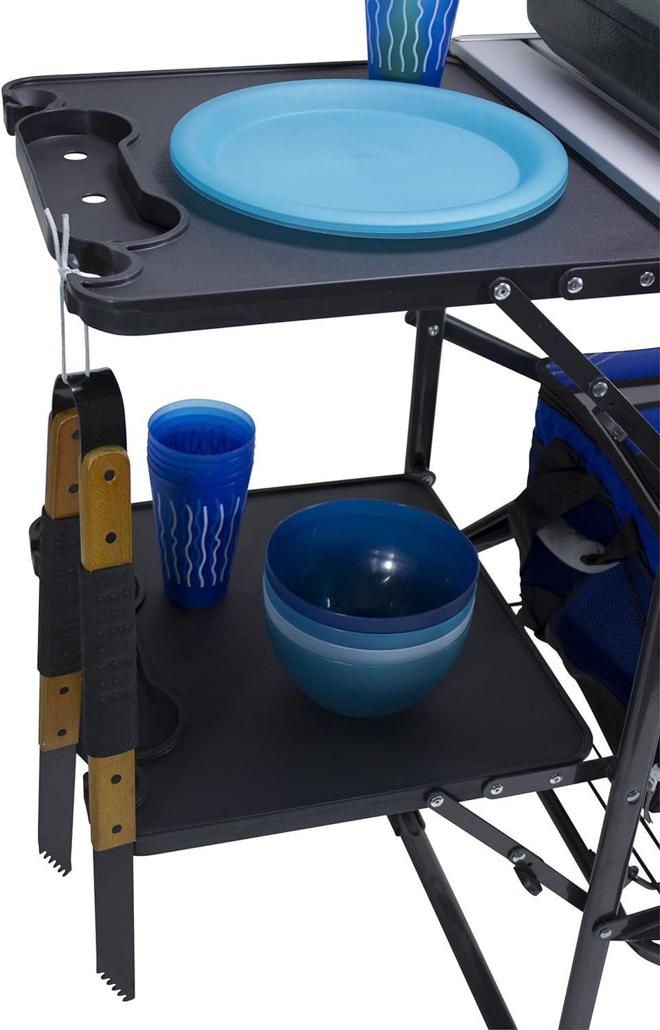 Specialized Shelving: Grill table features a heat-resistant aluminum countertop (48-lb. weight limit) for camp stoves; Outdoor prep table also includes a lower rack (35-lb. weight limit) for dry good storage.