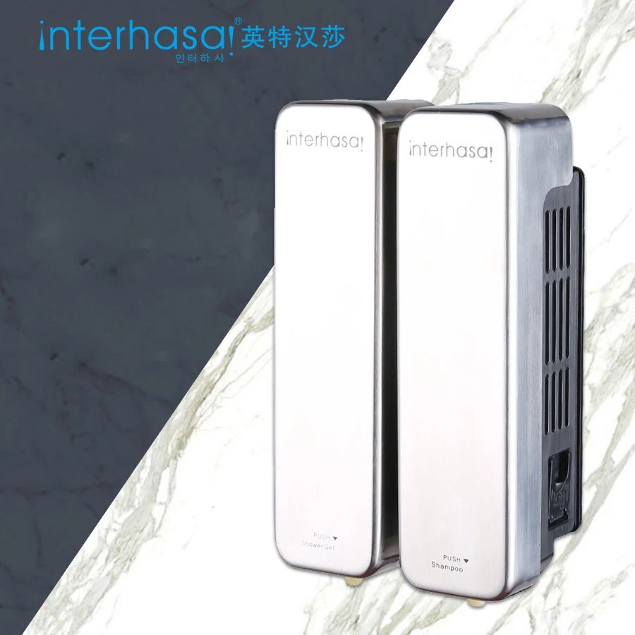 Dispensador manual de jabón y champú para ducha de hotel de 1000 ml con doble pared, de acero inoxidable, con recipiente translúcido.