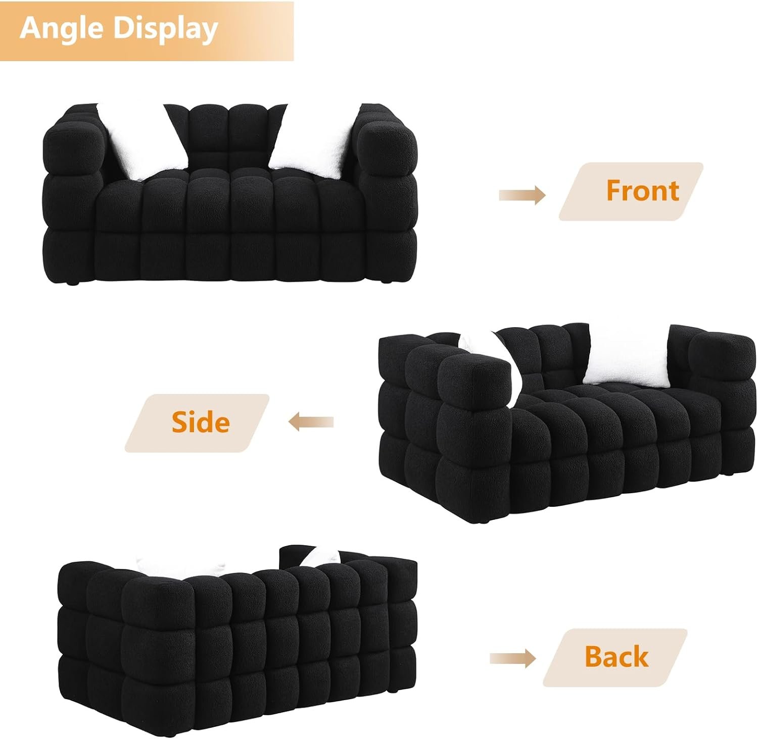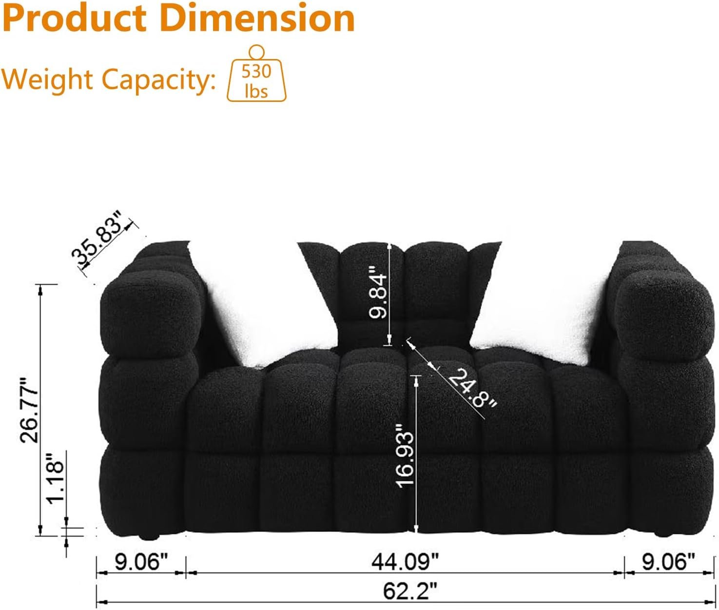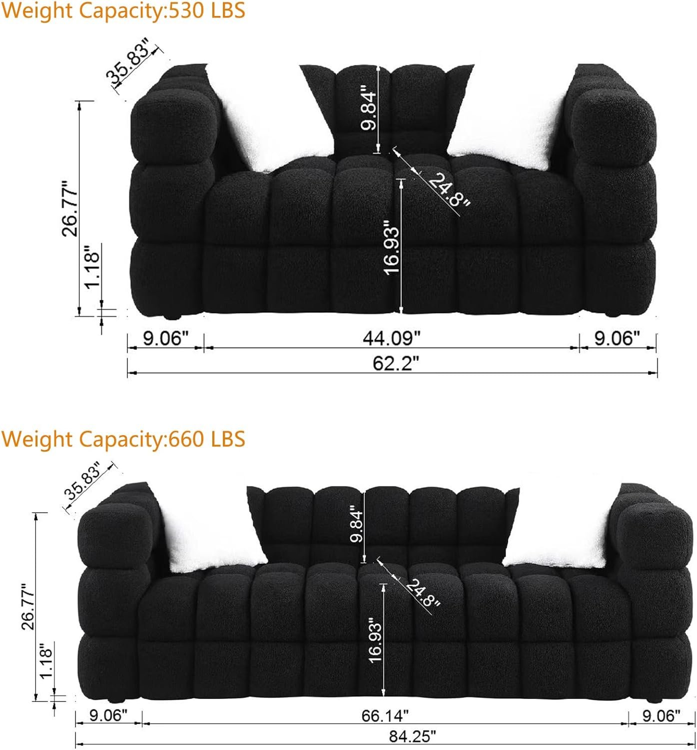 Modern Cloud Design: This chic sofa set, comprising a loveseat and a 3-seater sofa, boasts a modern cloud-like silhouette. With its soft, marshmallow-like curves and complemented by 4 accent pillows, it strikes the perfect balance between style and comfort 🛋️