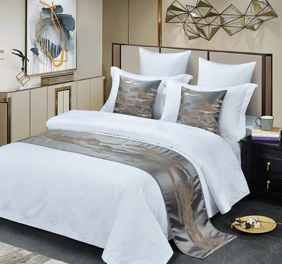 Juego de camino de cama y funda de cojín de lujo tamaño queen y king con logotipo personalizado para hotel, venta al por mayor