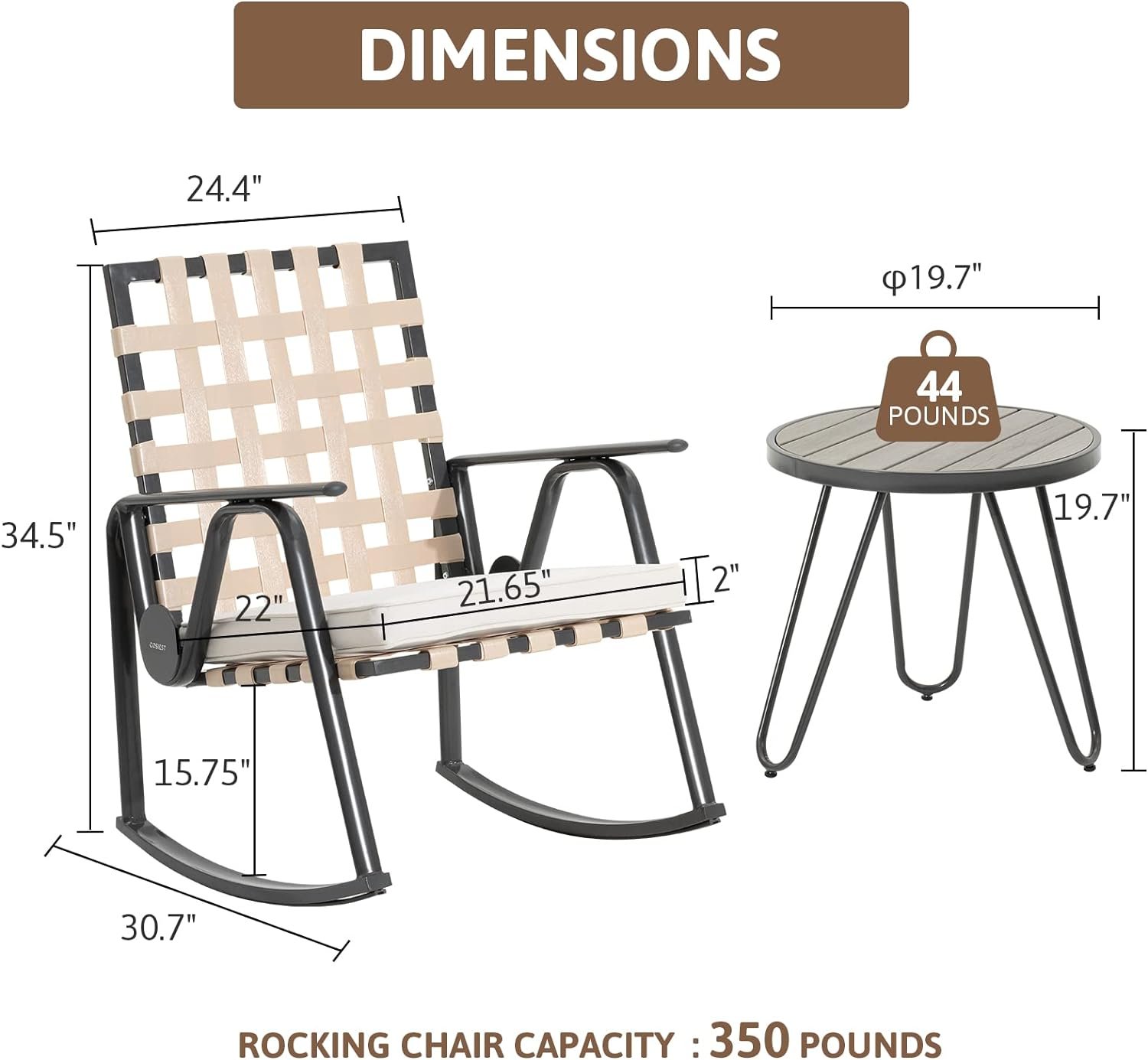 - Each chair: 30.7″ D x 24.4″ W x 34.5″ H