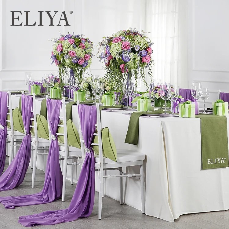 Venta al por mayor de fundas para sillas de boda de color marfil, bandas de gasa y organza con volantes para fiestas, banquetes y decoración.