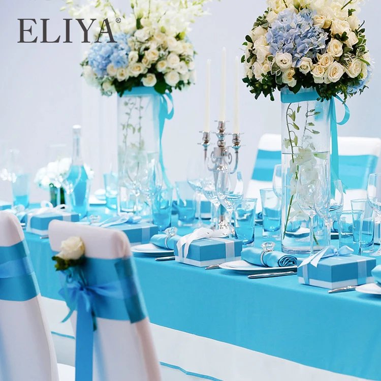 Fundas elásticas de satén de lujo para sillas en azul y blanco, ideales para cenas, iglesias, eventos, banquetes, bodas, fiestas y decoración de hoteles.