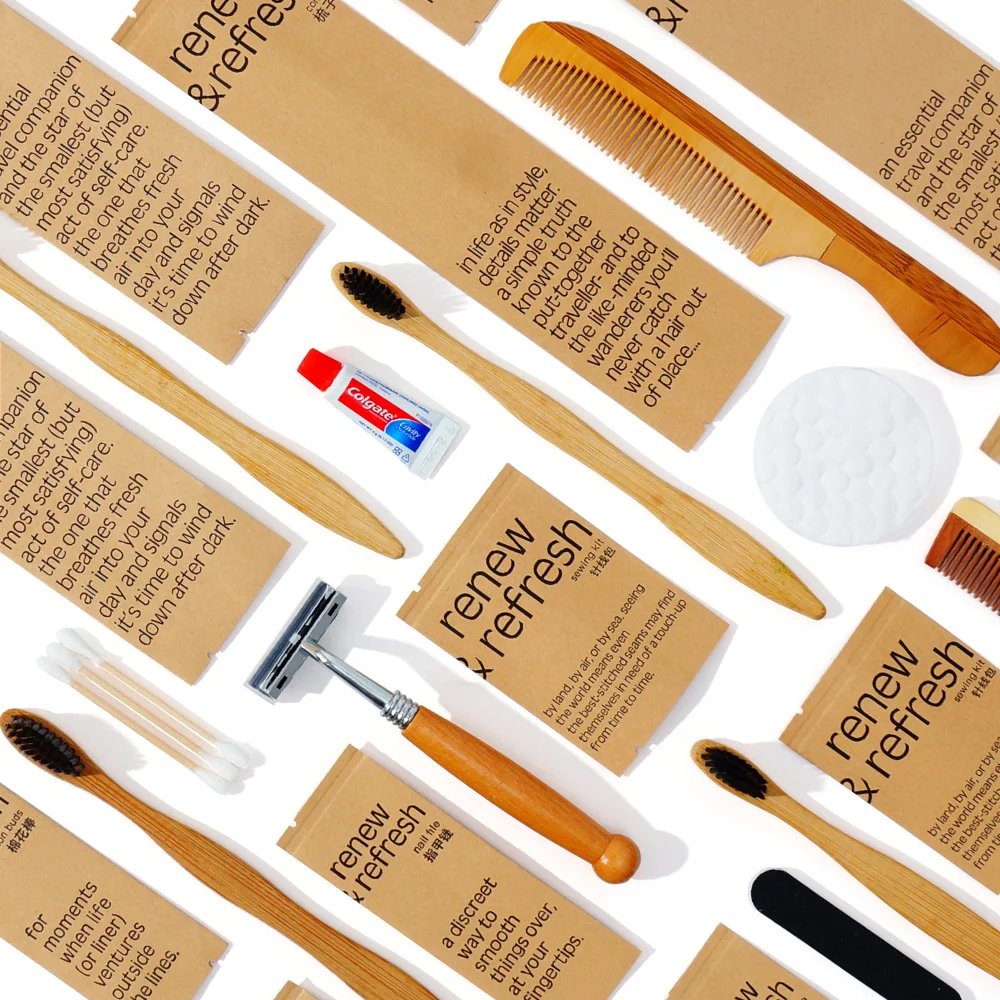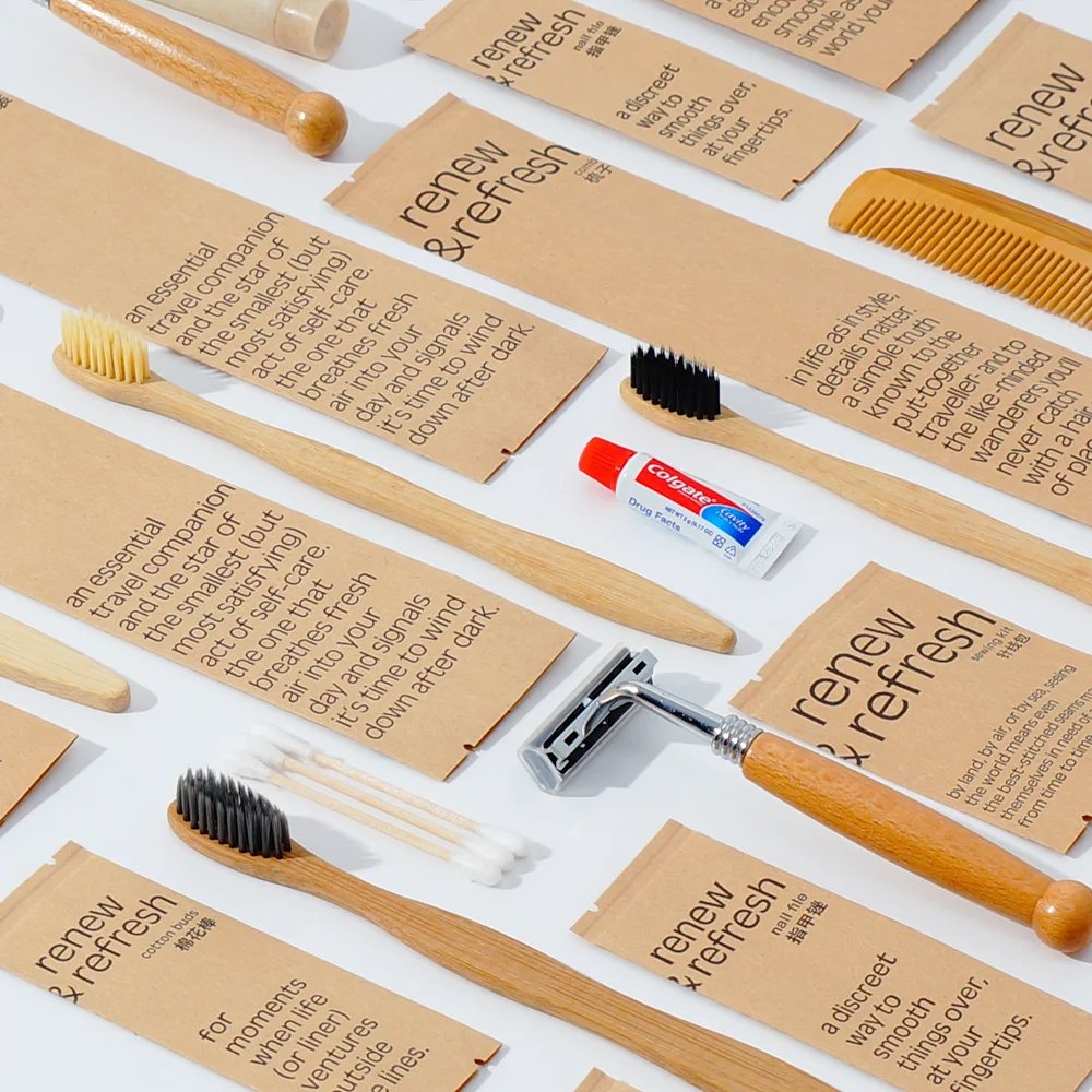 21 valoraciones en Custom Logo Eco Friendly Biodegradable Craft Paper Packed Hotel Resort Dry Amenities with Shaving Dental Vanity Sewing Kit