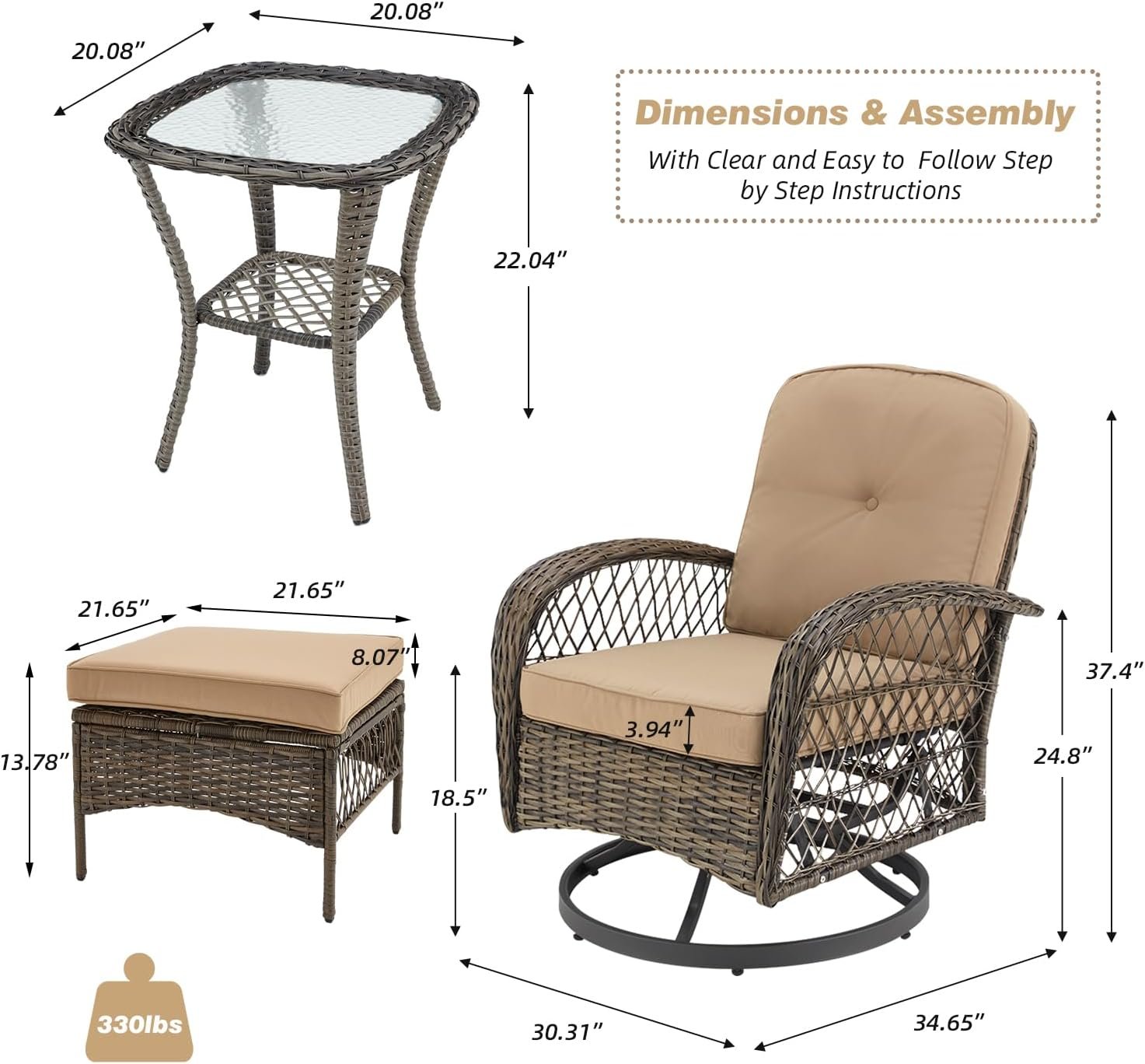 💪 Premium Quality Materials: Built to last, the black coated heavy steel frame ensures stability and a strong load-bearing capacity of up to 330lbs. The all-weather round wicker withstands the elements, while the cushions feature high-density sponge filling for resilience and comfort. They are also removable and washable for easy maintenance.