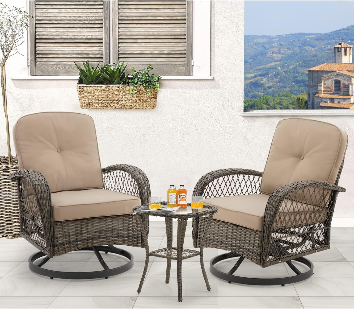 🪑 Ultimate Comfort and Convenience: Experience the perfect blend of rocking and 360-degree swivel functionality with this set. The rattan swivel chair rotates 360°, allowing you to enjoy panoramic views without moving the sofa, bask in the scenery, and engage in conversations freely.
