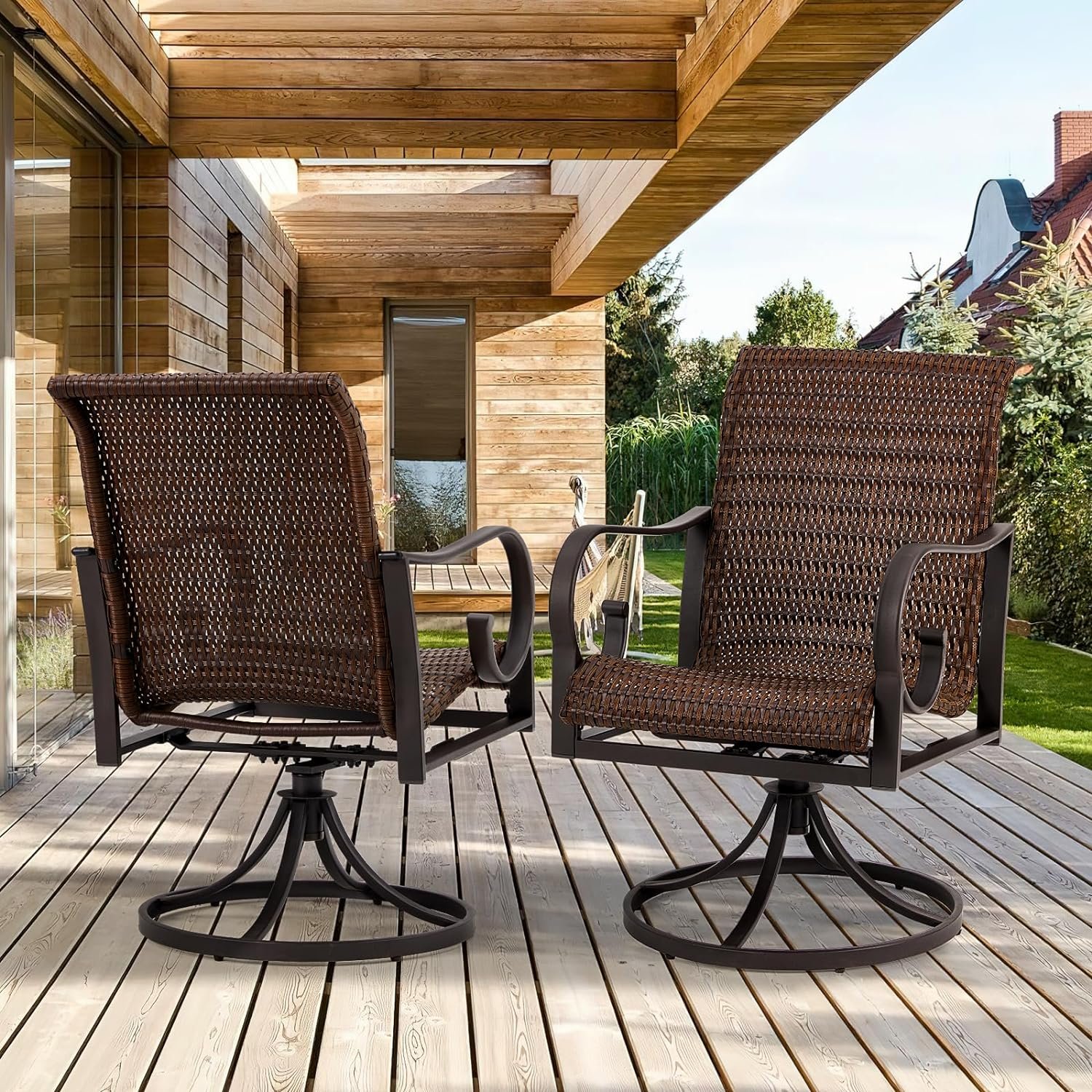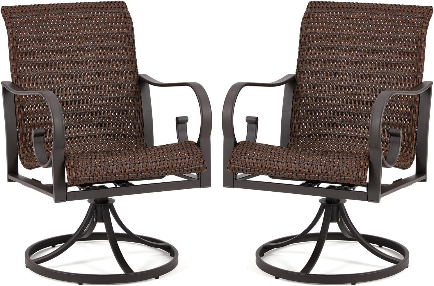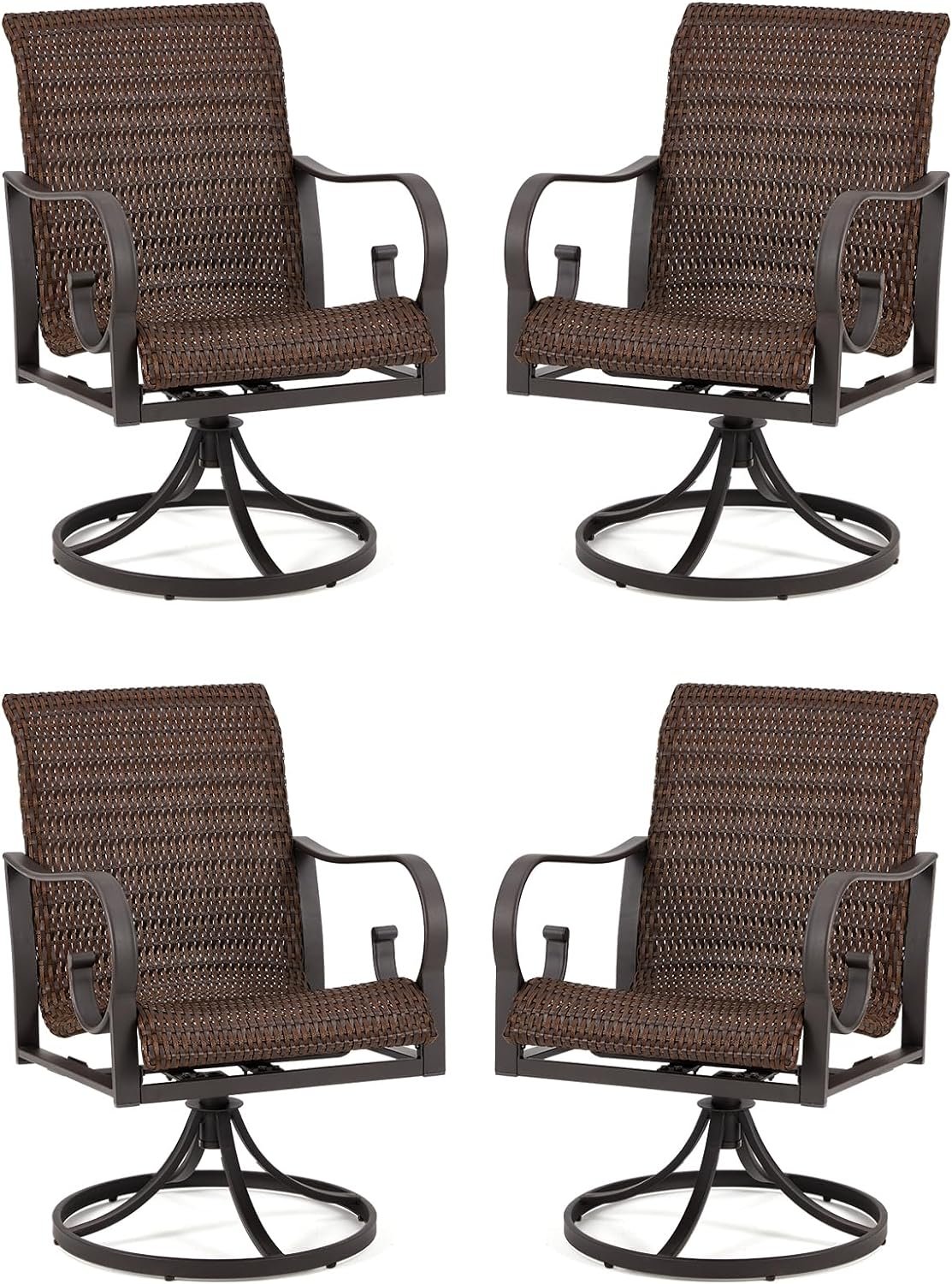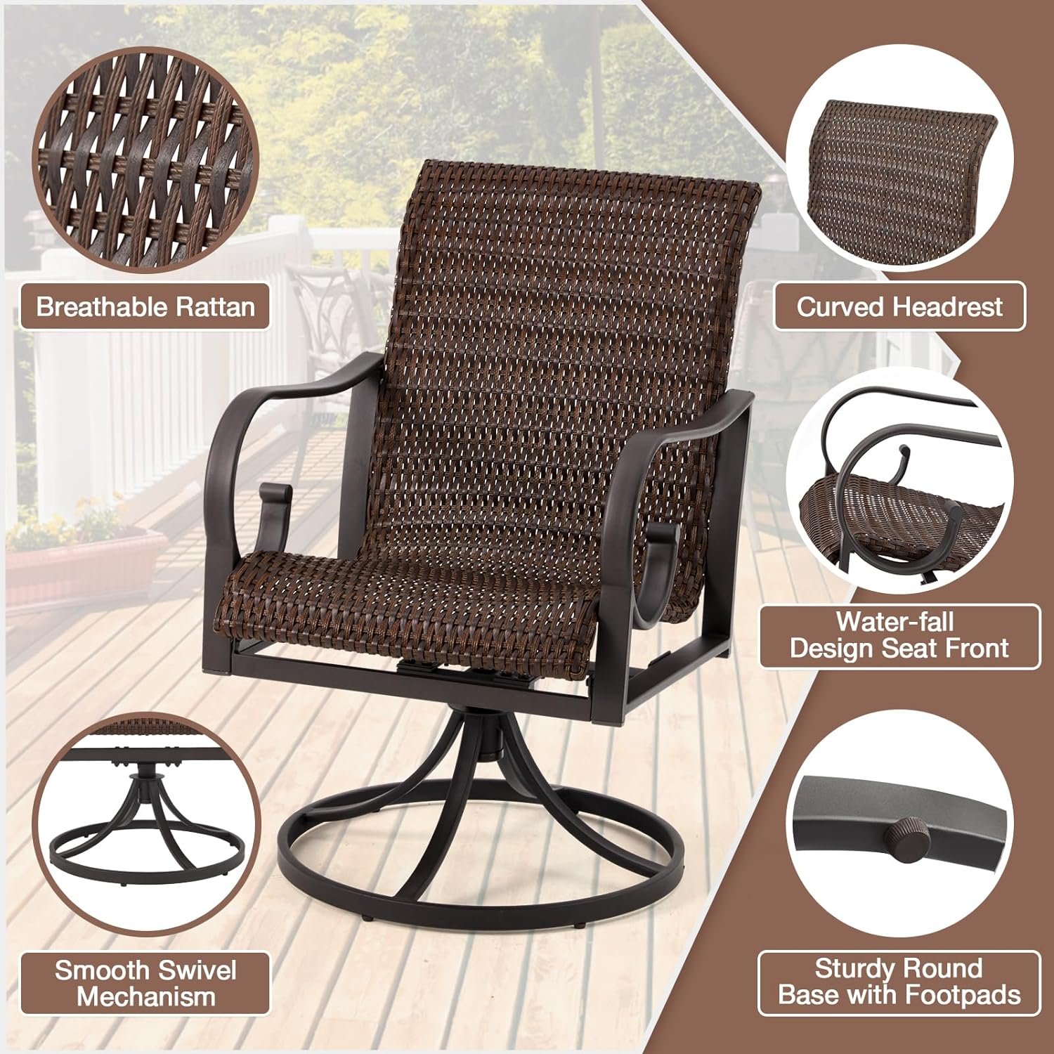 🪑 Comfortable Ergonomic Design: Experience ultimate relaxation with the ergonomic design of these PE rattan patio dining swivel wicker chairs. The waterfall front seat design, combined with a 23.5-inch high back and curved headrest, ensures optimal comfort and relaxation. Perfect for use on patios, decks, gardens, poolside areas, and indoor spaces.