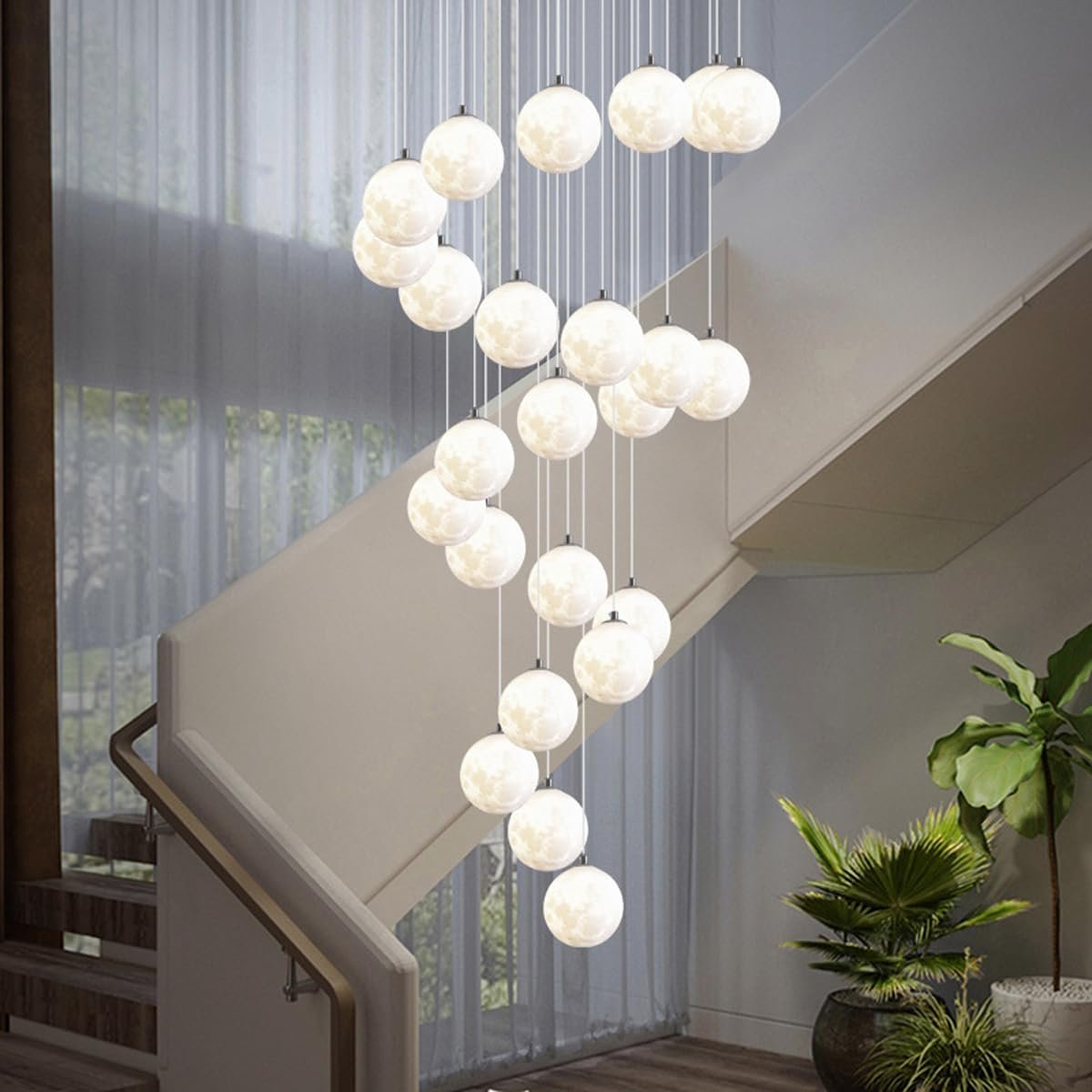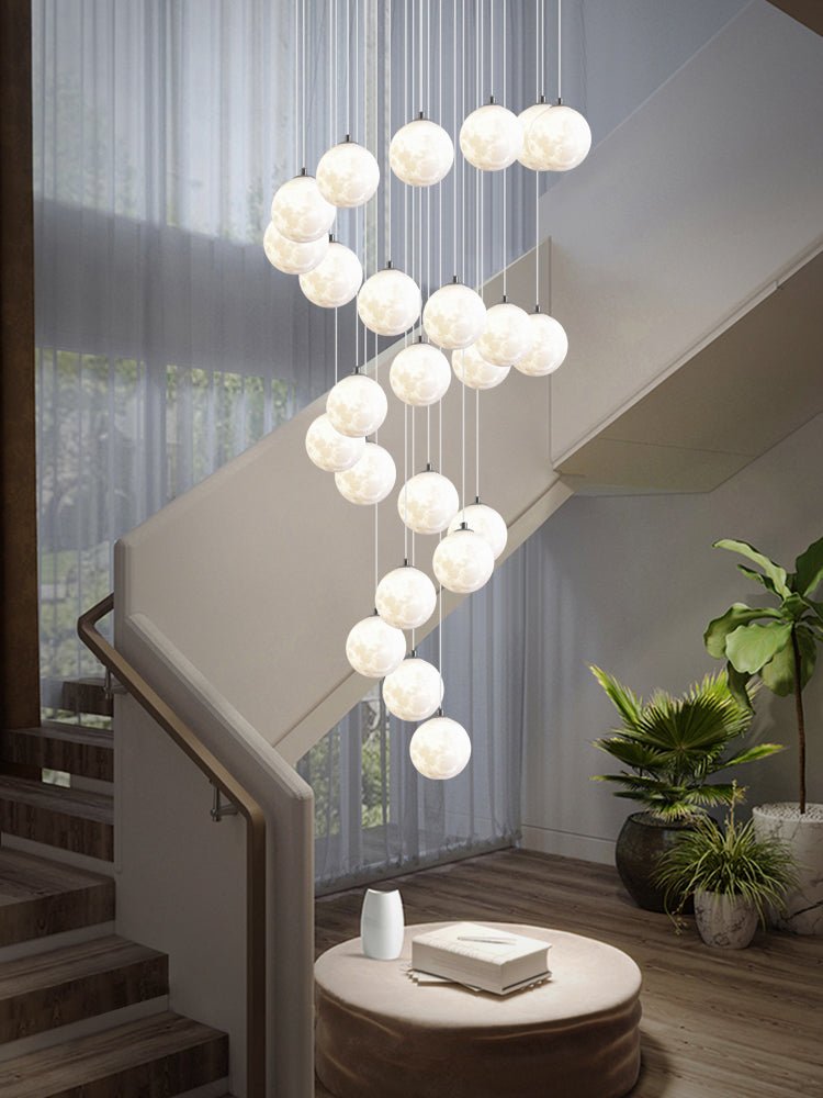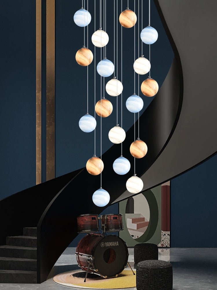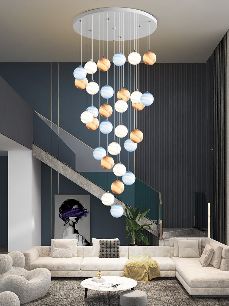 - Ya sea para realzar la grandeza del lobby de un hotel, agregar elegancia a una villa o brindar un toque lujoso a una escalera o patio, la lámpara colgante Luxurious Planet eleva su espacio con su diseño de alta gama e iluminación atmosférica.