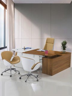 Elegante conjunto de escritorio y silla para oficina financiera que mejora la productividad