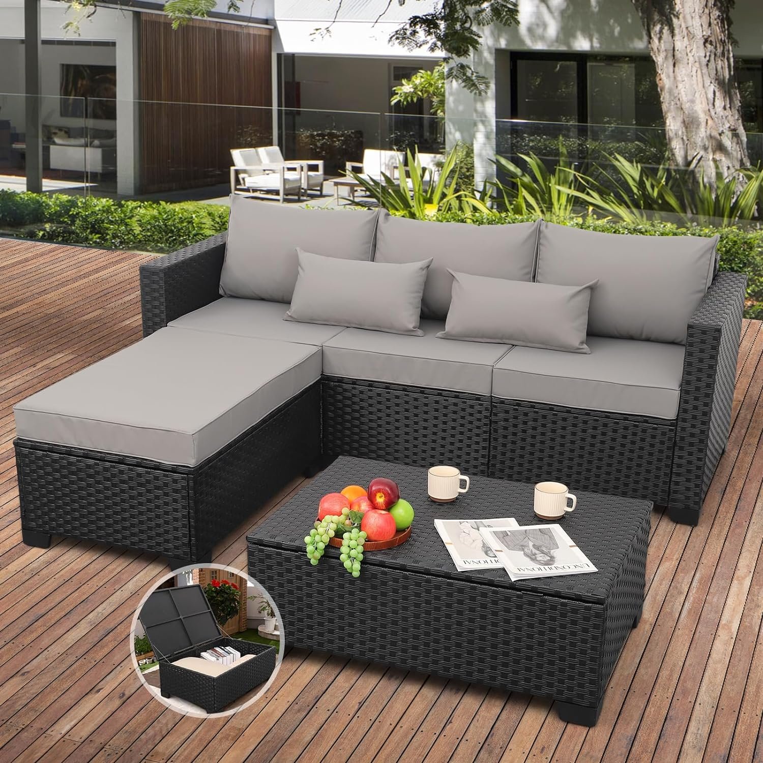 🌿 Versatile Outdoor Sectional Furniture: Elevate your outdoor space with this sectional furniture set, featuring a differentiated design and distinctive coffee table with storage. With a powder-coated steel frame and dense all-weather wicker, this set offers both style and durability for your outdoor oasis.