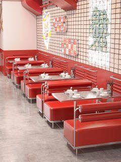 Cabinas para hamburgueserías y hamburgueserías con temática roja personalizadas
