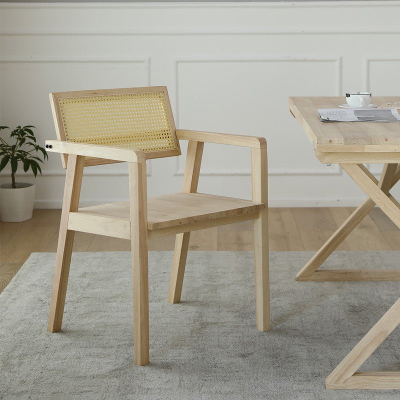 La silla de comedor Hudson está hecha de madera de teca y presenta detalles en caña.