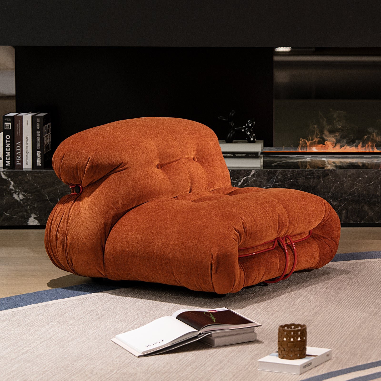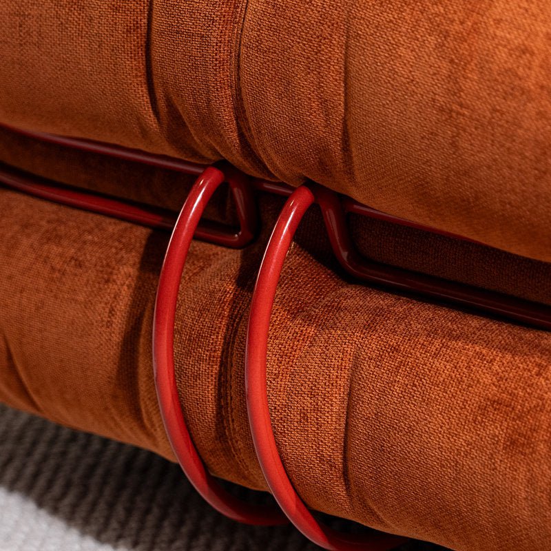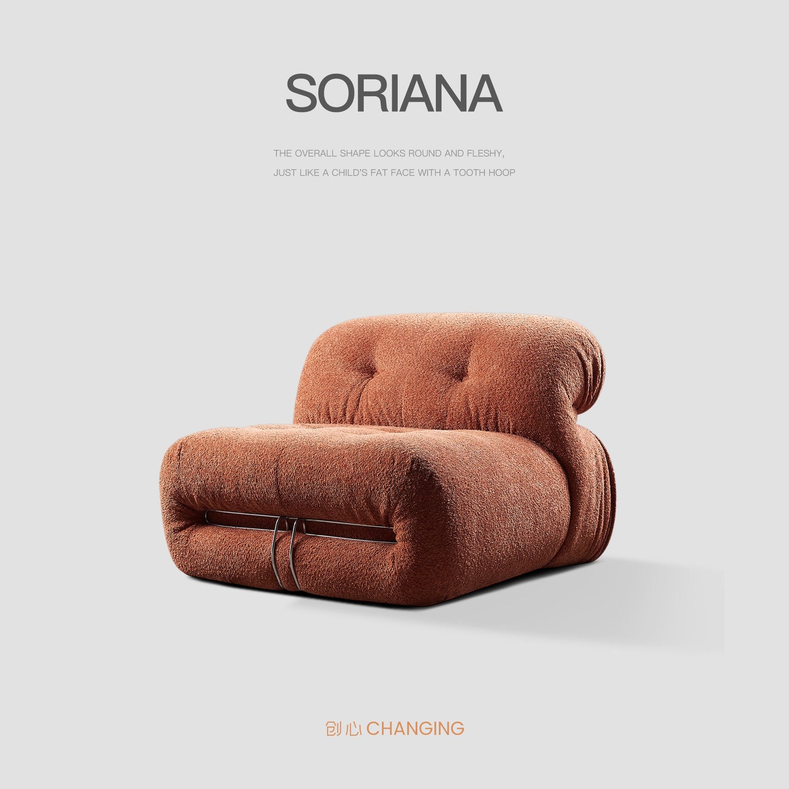 The unique curvilinear shape of this sofa chair, inspired by the human form, ensures the utmost comfort. Its body, wrapped in plush upholstery and supported by a sturdy metal brace, is both stylish and durable. The seat and backrest cushions are adorned with a quilted effect, featuring upholstered buttons that add to its charm. The use of high-quality materials like Chenille knitted fabric and metal guarantees longevity and enduring appeal.