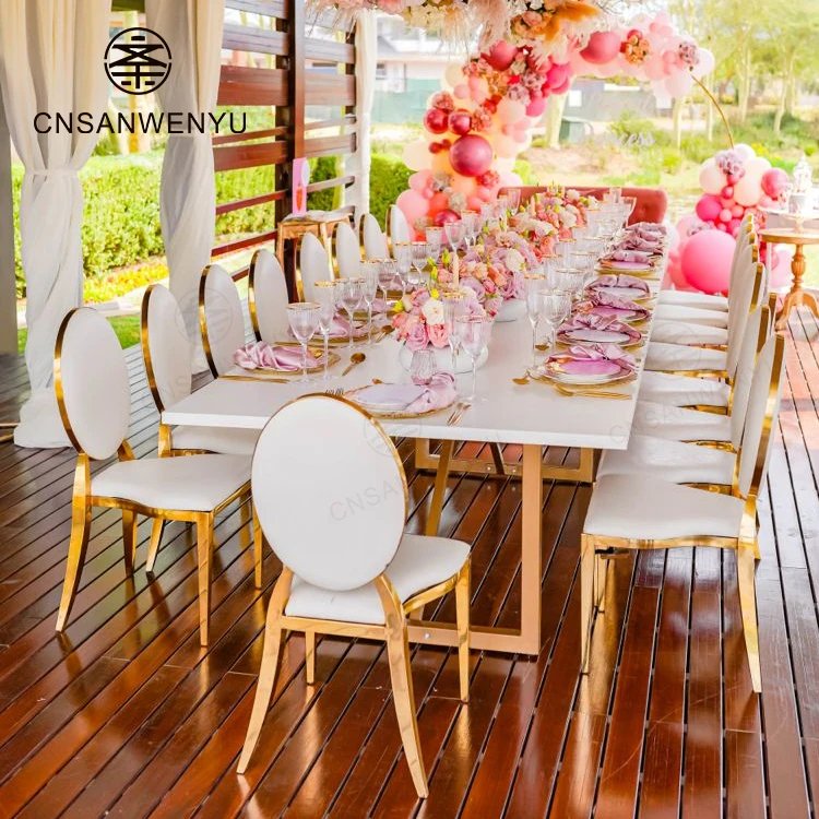 Venta al por mayor blanco superior acero inoxidable oro curvado boda serpentina mesa de lujo