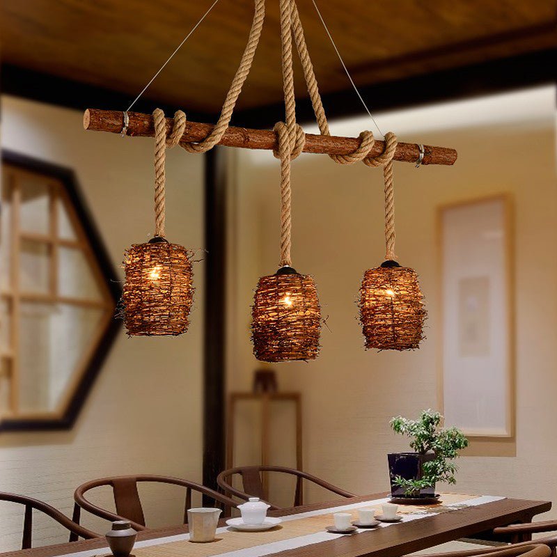 Rattan Woven Nest Island Pendant: Rustic 3-Bulb Dining Light