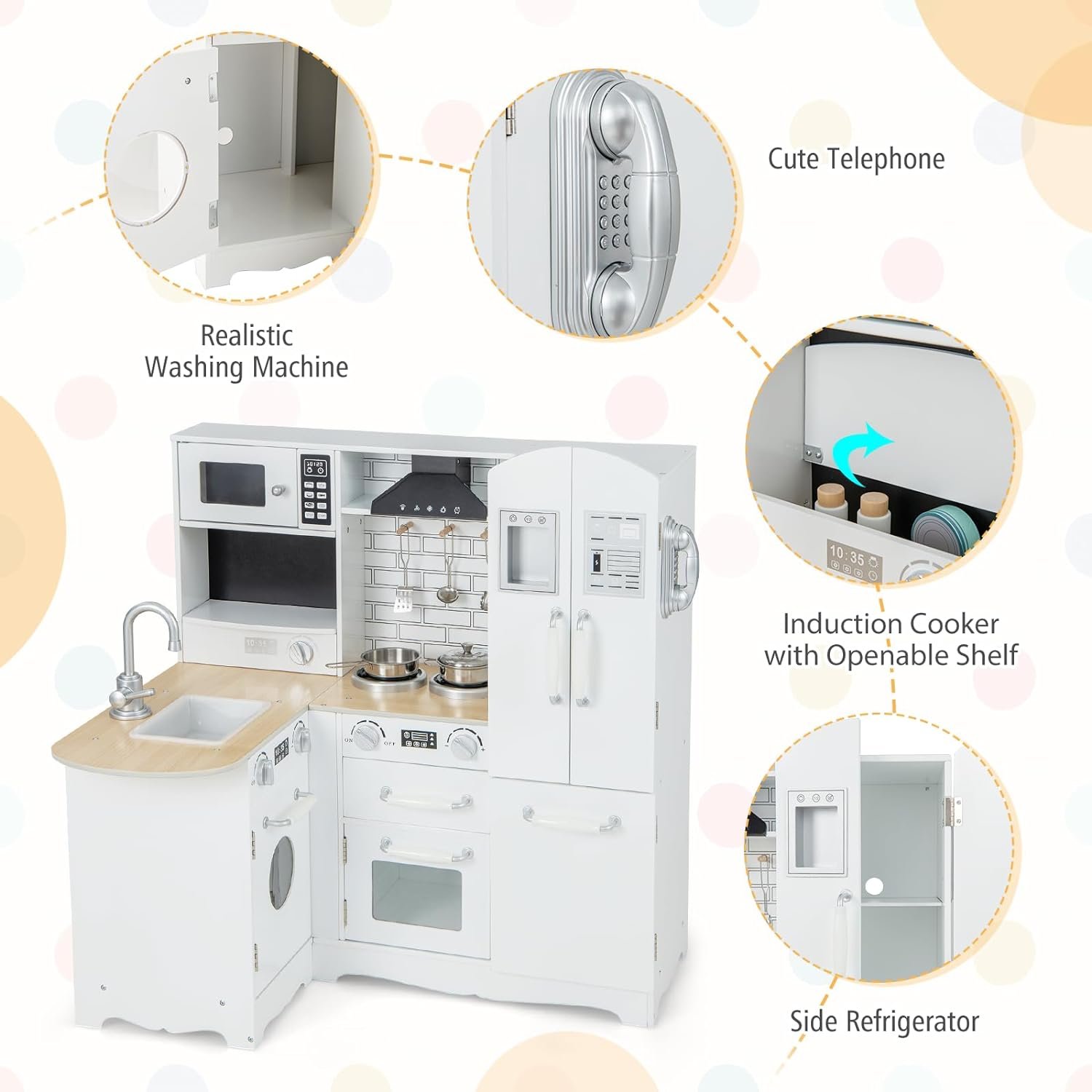 🍳 11-in-1 Kitchen Playset: Spark your child’s imagination with this comprehensive kitchen playset! Modeled after a real kitchen, it features a washing machine, range hood, stove, oven, microwave, water dispenser, side refrigerator, sink & faucet, induction cooker, and telephone. These realistic appliances create an immersive gaming experience while fostering cognitive, hands-on, and social skills.