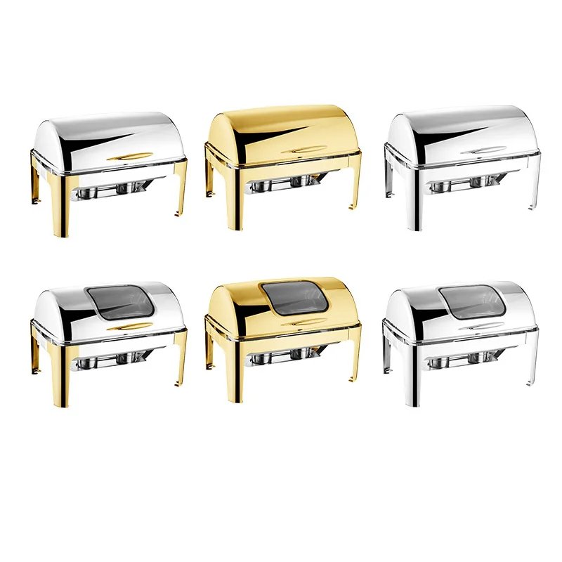 Gold Catering Equipment Buffet Heating Pots Set Stainless Steel Round Chafing Dish With Glass and Metal for Hotel Use
