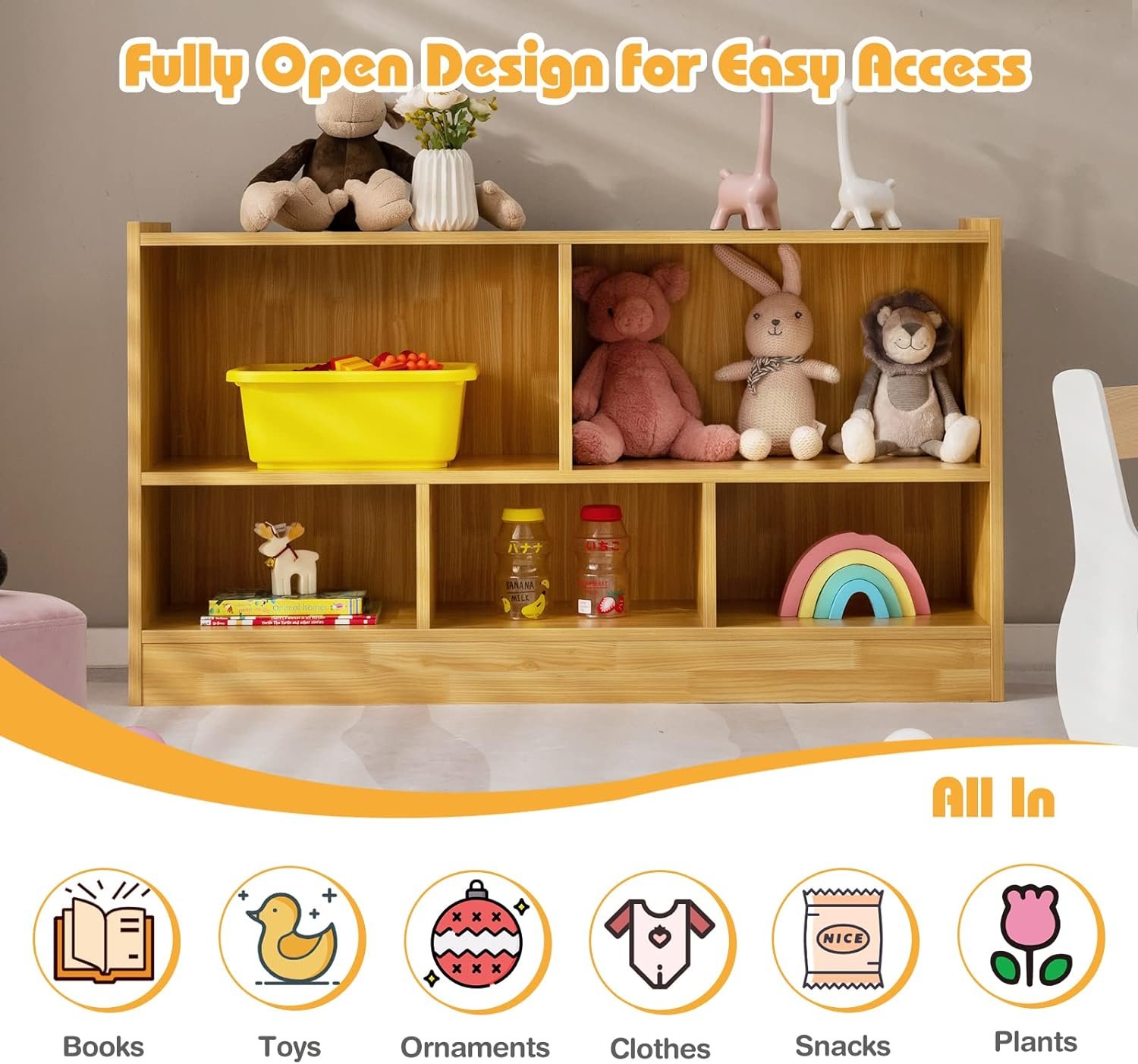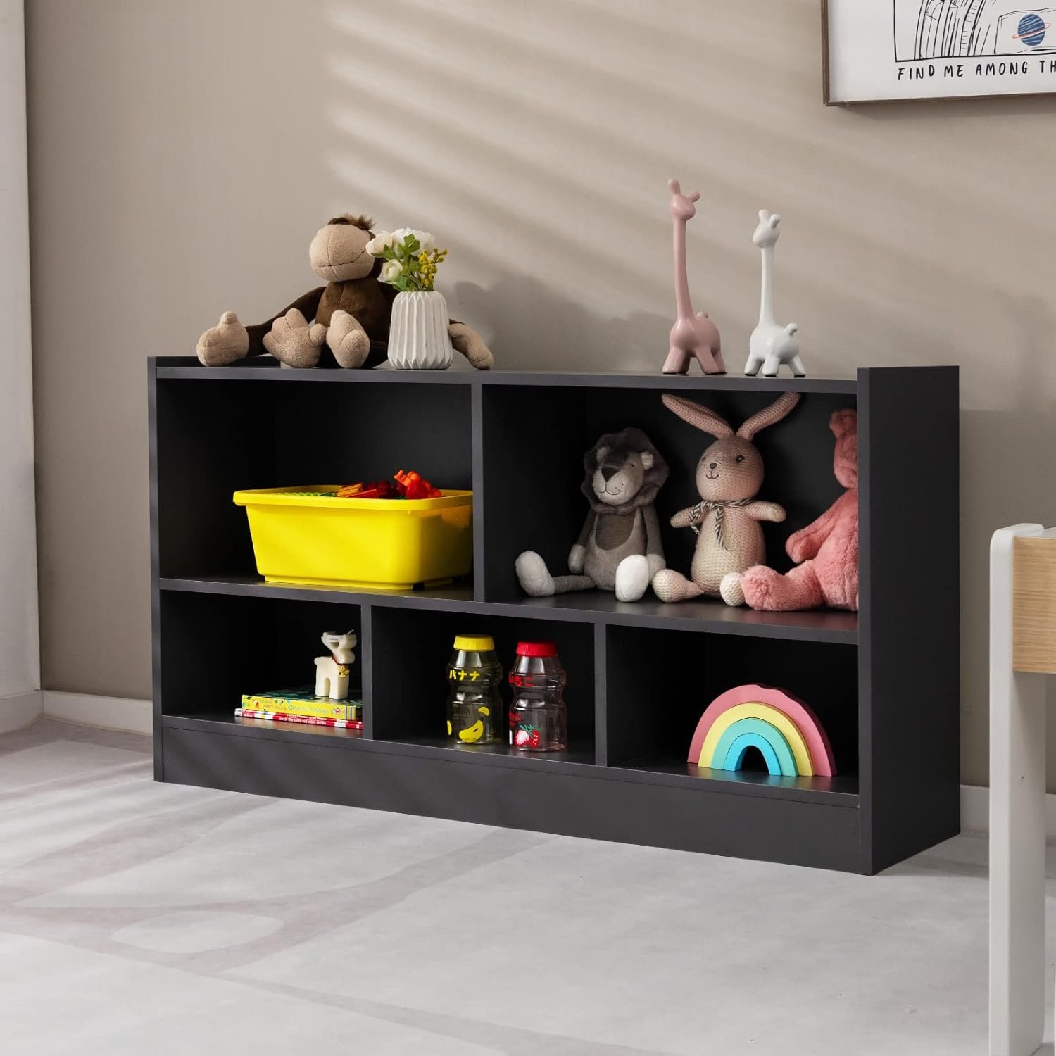 📚 Ample Storage Space: Keep your kids’ room well-organized with our two-tier cabinet featuring 5-section compartments. Perfect for storing cartoon books, toys, snacks, clothes, and school supplies. The spacious top with raised edges is ideal for displaying photos, potted plants, and more.