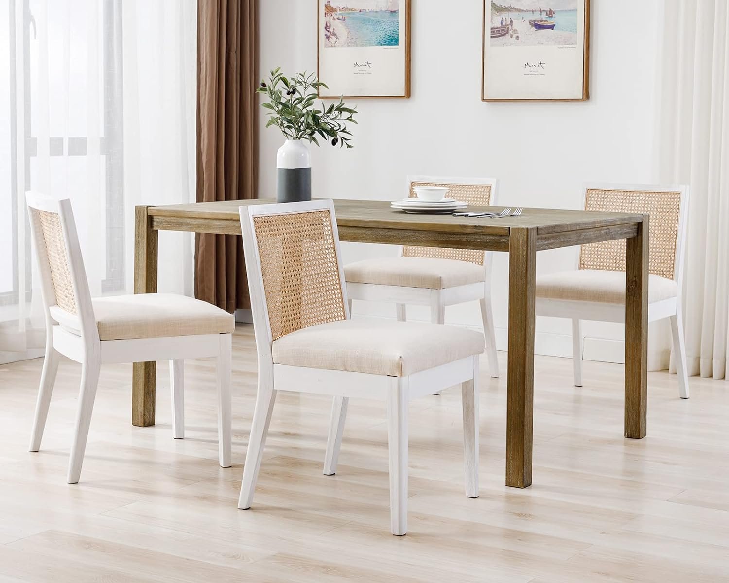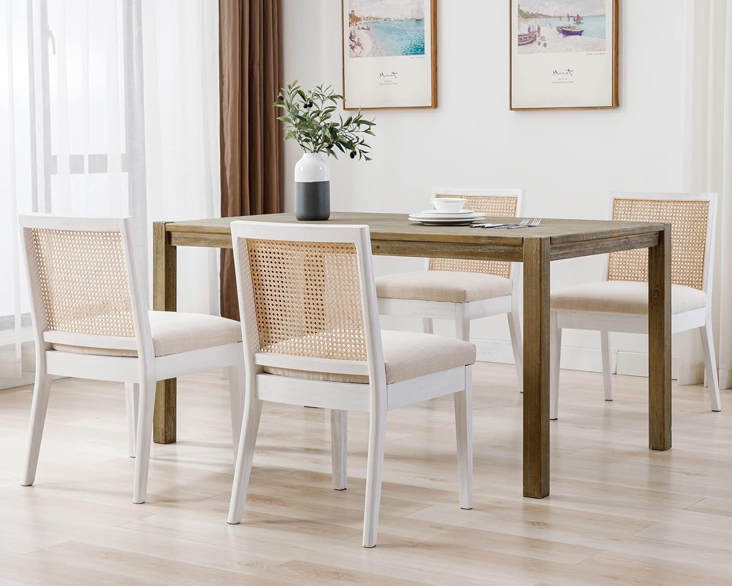 Farmhouse Charm: The defining feature of these dining chairs is their square back design, accented with a cane inset. This classic farmhouse element brings a touch of rustic charm to any dining space. The solid wood frame boasts a finished hue with subtle distressing, offering an antiqued look that adds character and warmth. 🏡🌾