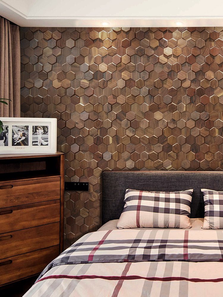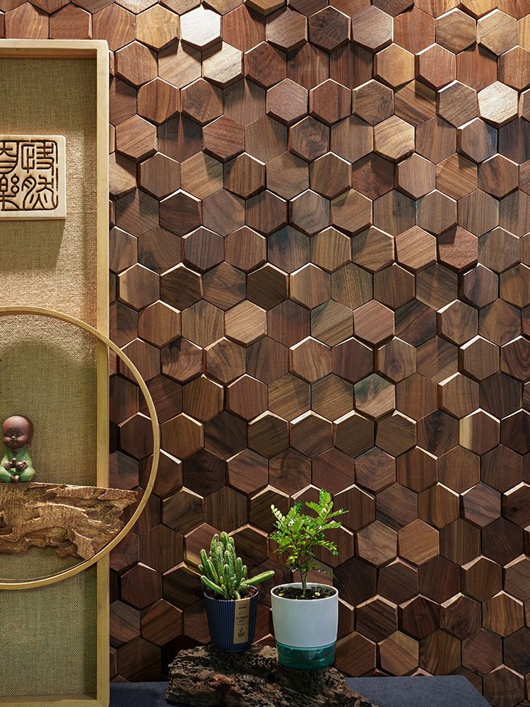 Décoration murale en mosaïque de bois hexagonale en noyer noir