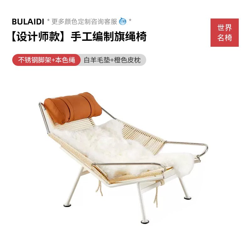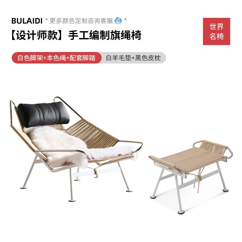 Elevate your space with our designer hand-woven flag rope leisure chair. Perfect for the living room or balcony, this unique chair features real wool upholstery and offers both style and comfort for a standout addition to your home.